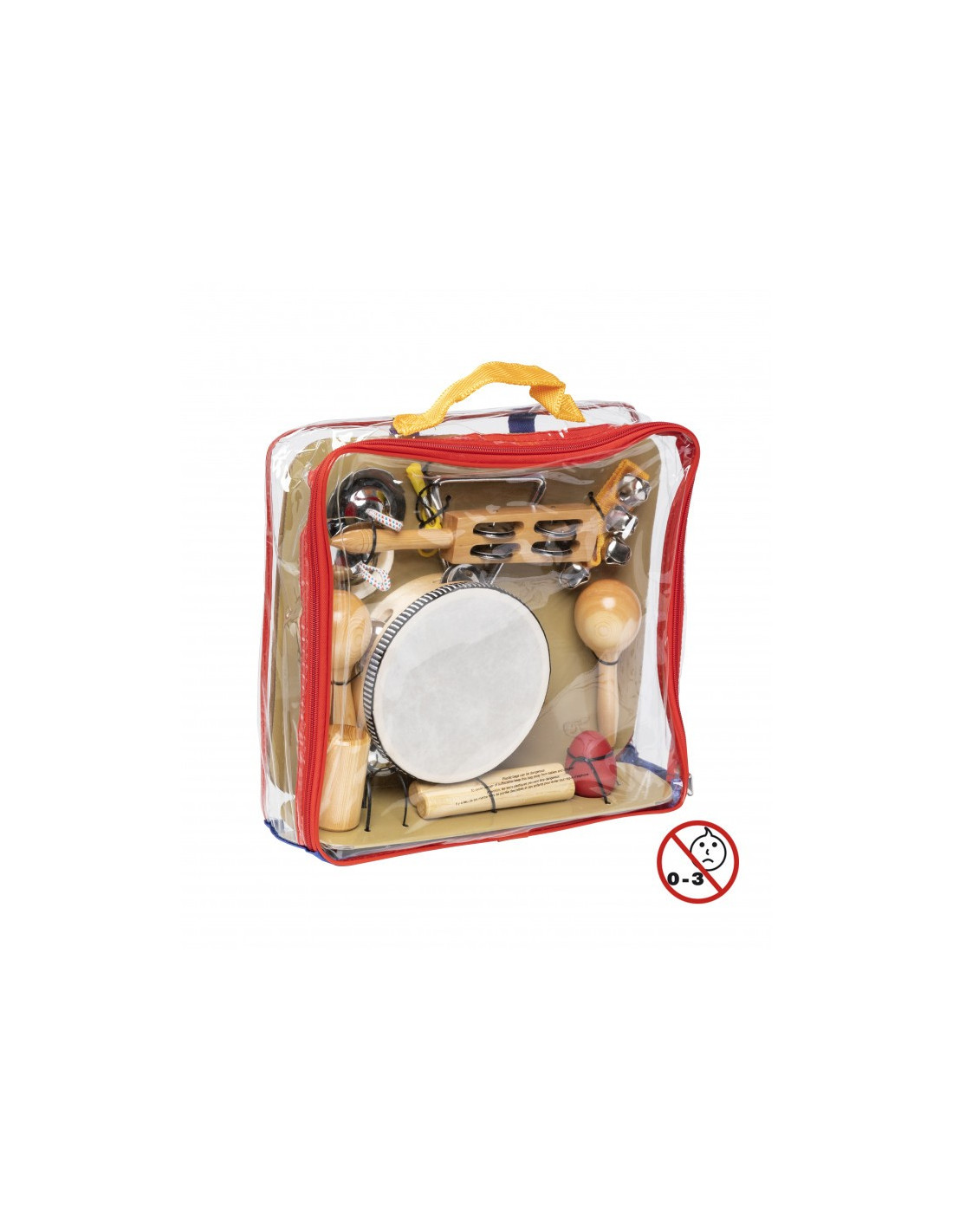Set de petites percussions Kids Tune pour enfants - Comprend: 1 triangle chromé de 10 x 2 cm avec battant, 1 paire de claves en bois de 10 x 2 cm, 1 tambourin de 6" pré-accordé avec 4 paires de cymbalettes, 1 paires de maracas en bois, 1 tube shaker en bois, 1 oeuf shaker en plastique, 4 paires de cymbalettes à manche en bois, 1 paires de crotales chromées, 1 bracelet à grelots - Label Jouet : Certification EN71 (Europe) ASTM F963 (USA) SOR (Canada): à partir de 3 ans