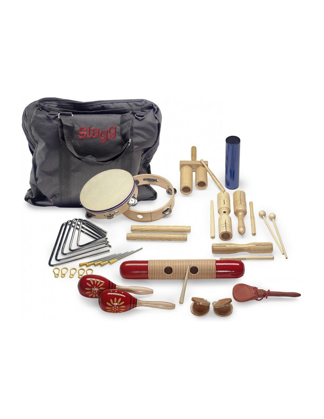 Kit percussion pour enfants, avec sac - comprenant: 1 tambourin avec peau, 1 tambourin sans peau, 1 paire de cloches agogo, 1 shaker, 1 tube résonant guiro, 2 doubles tubes résonants guiro, 1 paire de mailloches, 2 paires de castagnettes standard, 1 paire de castagnettes à manche, 1 paire de maracas, 5 triangles avec crochets et battants et 1 paire de claves - dans un sac facile à transporter.