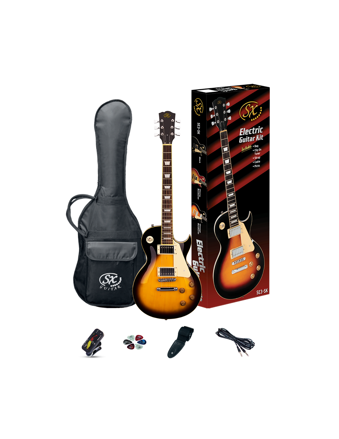 Pack guitare électrique Fingerboard Binding: ABS Inlayed, Vintage Yellow Scale: 625mm Body: Solid Basswood, Arched Top Top Bindings: ABS Inlayed, Vintage Yellow Neck: Selected Canadian Maple Truss Rod: 2 Way Truss Rod Fingerboard: Engineered Rosewood or Rosewood Frets: Nickel Number of Frets: 22 Position Marks: Blocks Inlayed, Imitation Pearl Machine Heads: Die-Cast, Chrome Nut: Synthetic Bone Nut Width: 43mm Bridge: Chrome Tailpiece: Chrome Pickups: 2 x Humbucker Controls: 2V. 2T., 3 Way Switch Pickguard: Vintage Yellow Color: Vintage Sunburst Finish: Glossy Accessories: SX Roboto X1 Clip-on Guitar Tuner, EB400/M Gig Bag, S40 Strap, 6 x GPH96 Picks, GC-10 10' Guitar Cable